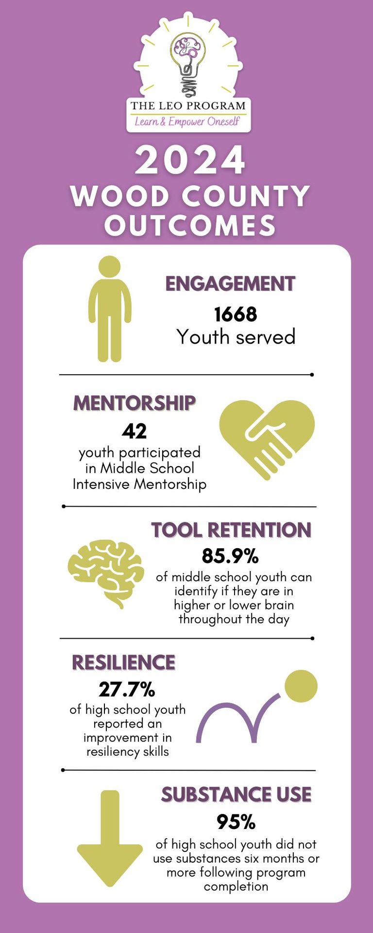 In 2019, Wood County Human Services Department was awarded the Brighter Futures Initiative (BFI) Substance Prevention grant to implement the Learn & Empower Oneself (LEO) program. CW Solutions is contracted to operate the program. Beginning in 2021, we added a second BFI program under a contract with Adams County Health & Human Services Department. The curriculum is derived from and inspired by concepts and tools by Dr. Nijhawn’s Life Ecology Organization, which were used to develop age-appropriate and youth-focused curriculum.